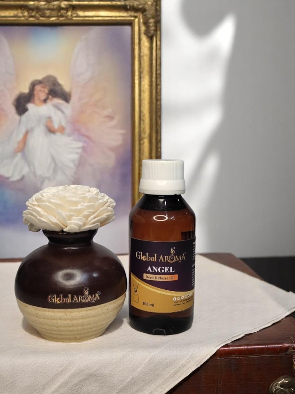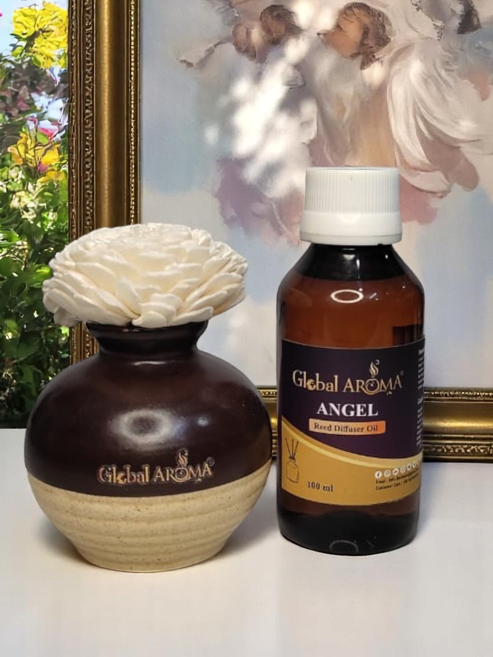 Elevate your home with the Global Aroma Angel Fragrance Reed Diffuser Set with Ceramic Pot. Featuring a stunning ceramic pot, this set delivers a long-lasting, heavenly scent.