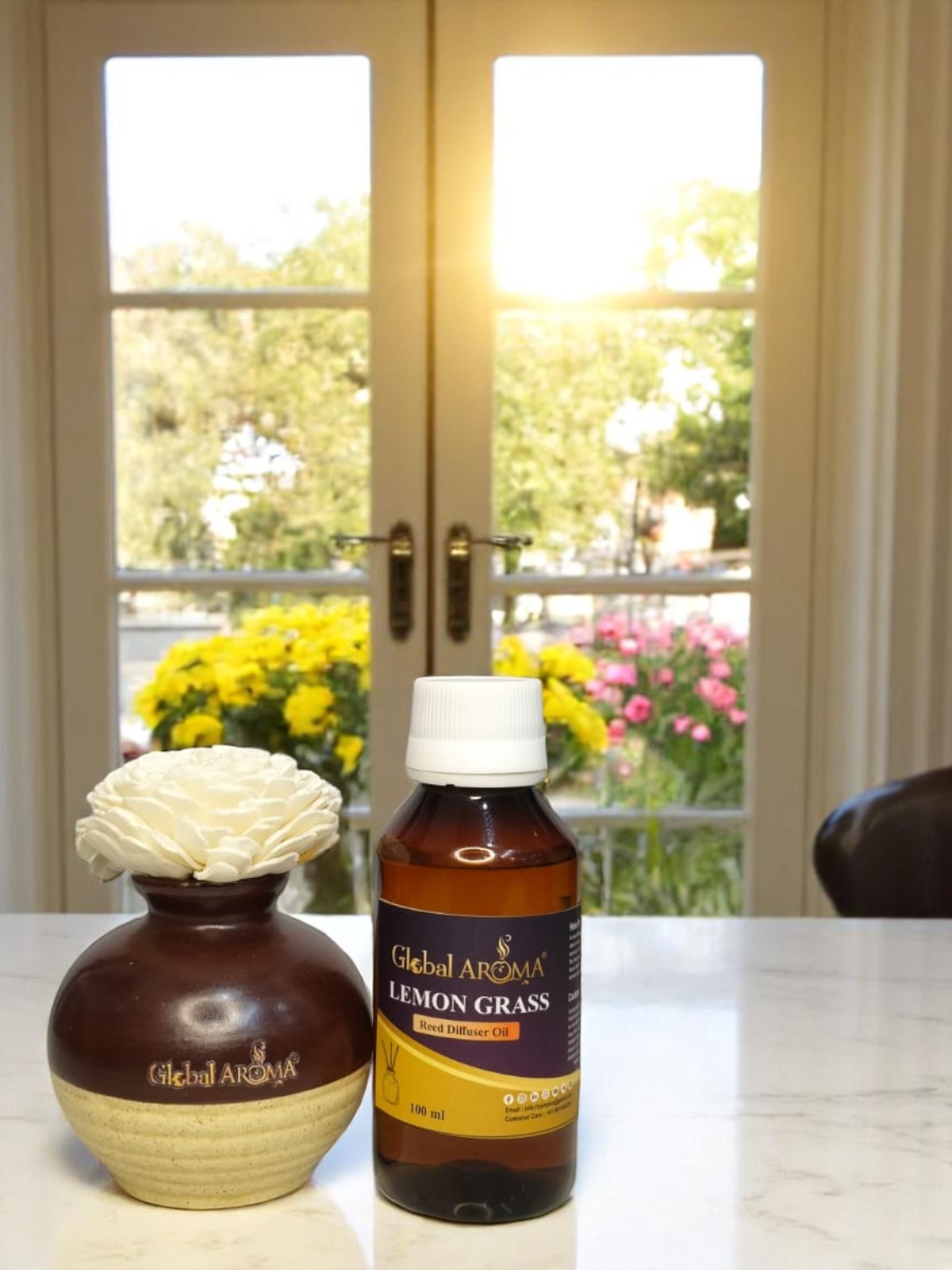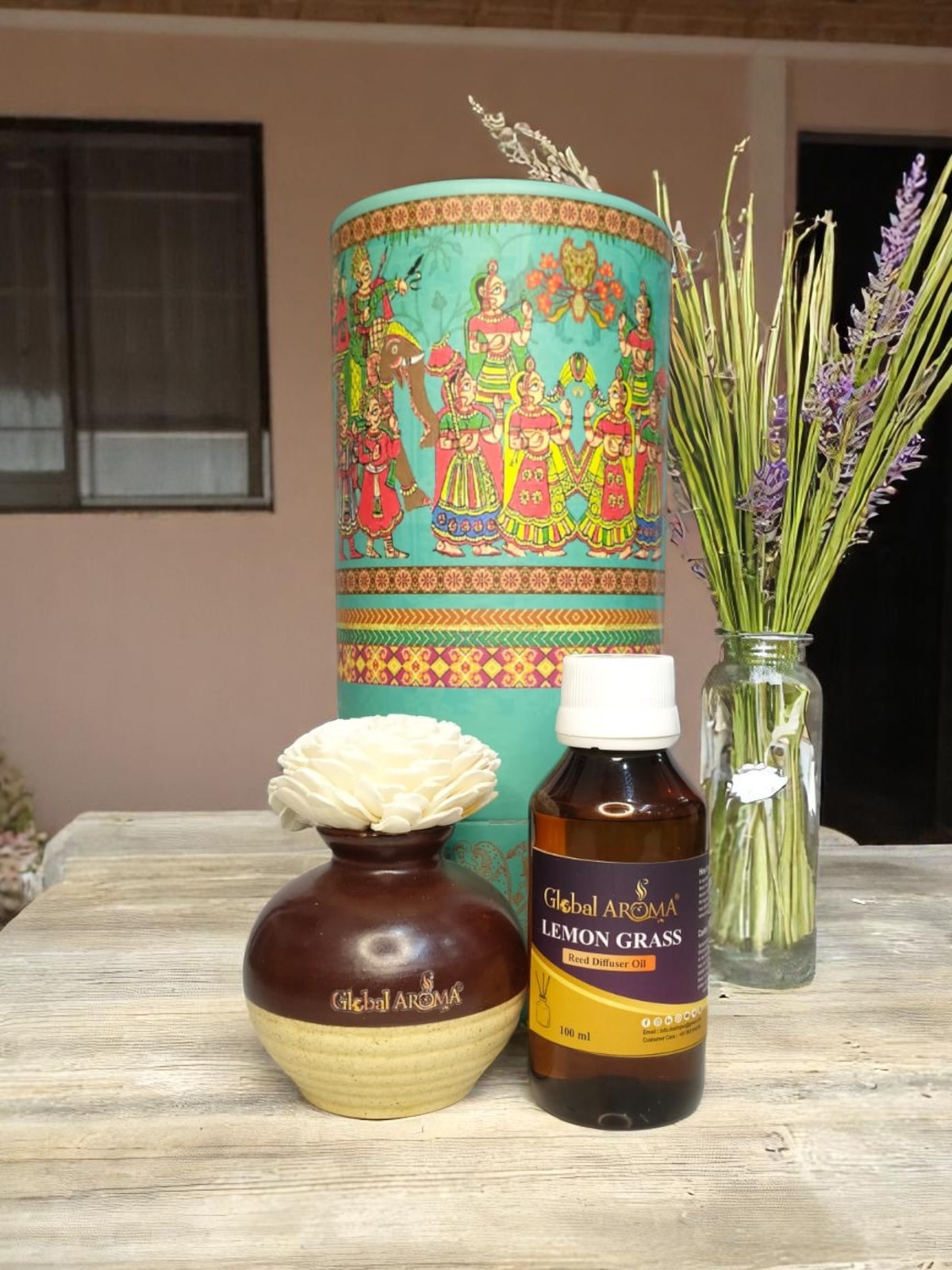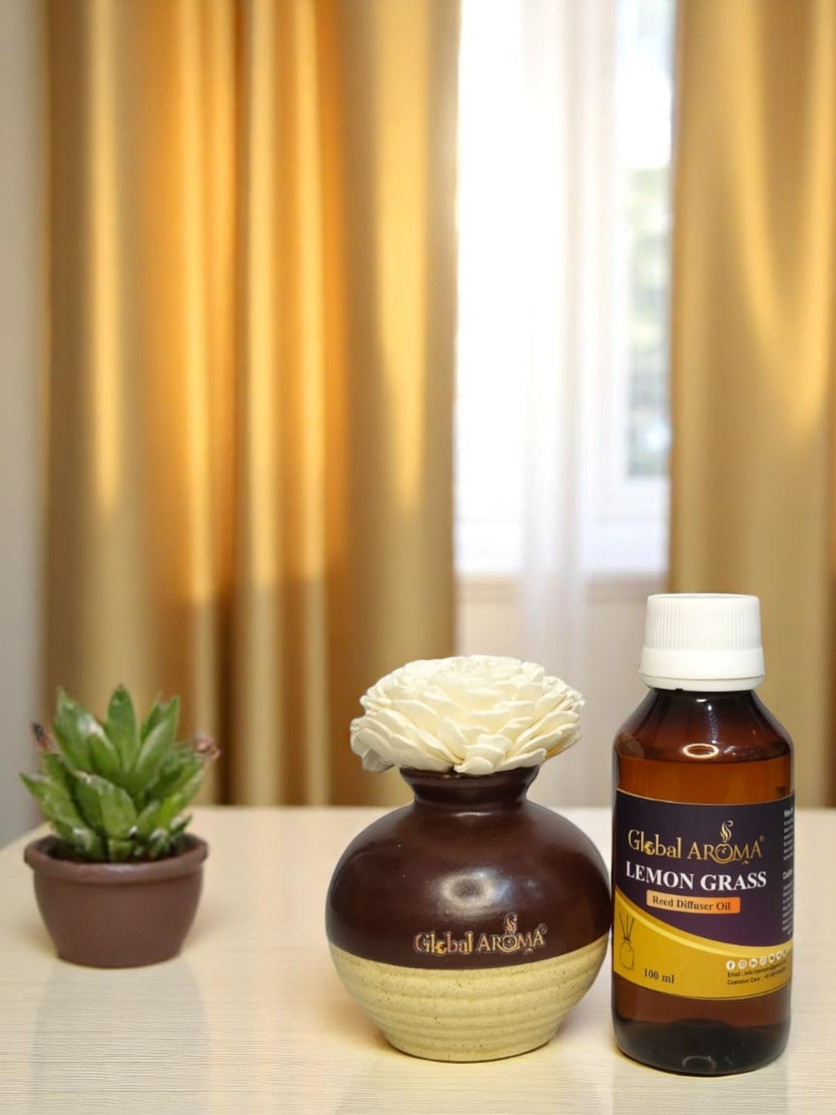 Cleanse your space with the Global Aroma Lemon Grass Set with Ceramic Pot. A chic ceramic pot diffuser featuring crisp, botanical notes for a spa-fresh, revitalizing feel.