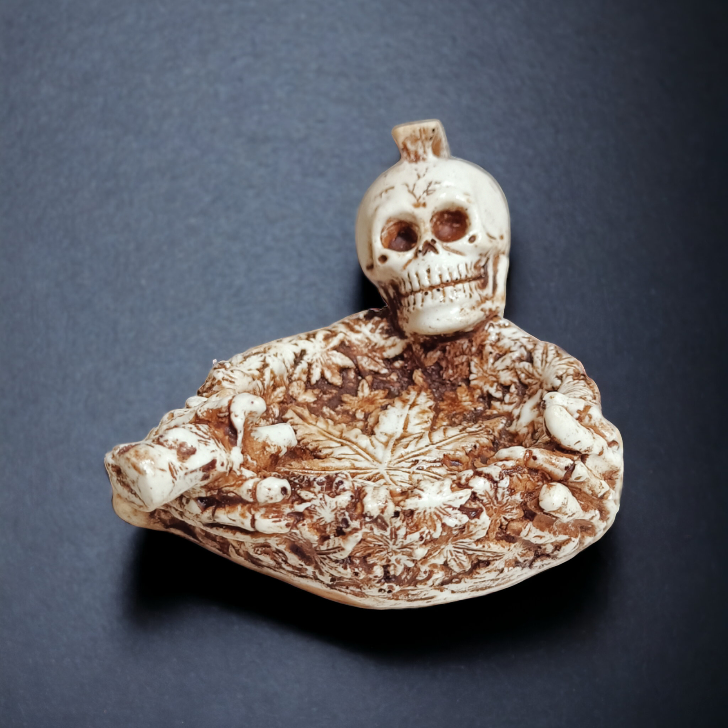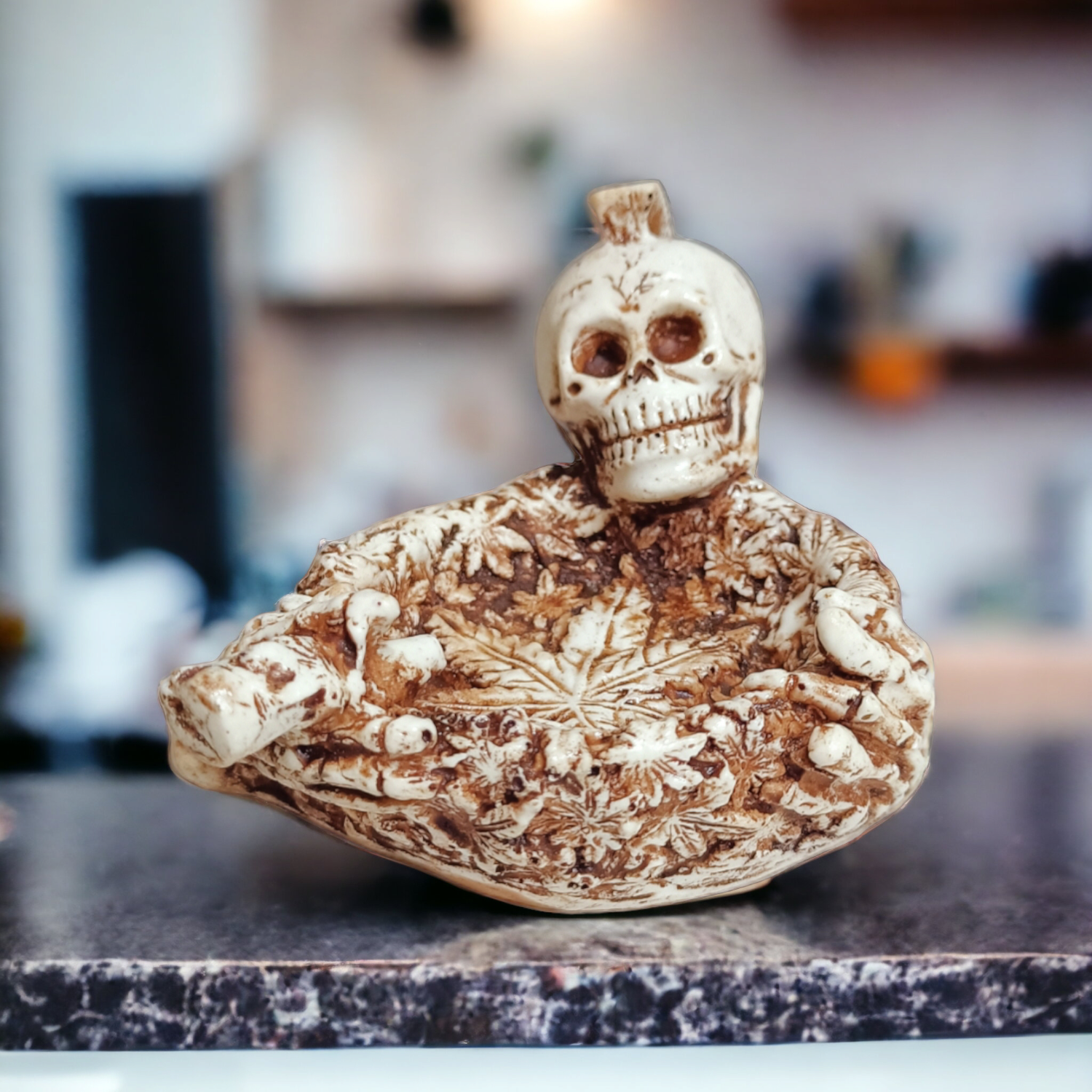Global Aroma Skeleton ashtray summons spooky style. Crafted from smooth resin with faux marble accents, its skull-and-crossbones motif turns an everyday accessory into a Gothic statement piece. While it’s washable design makes emptying ashes a cinch, you may find yourself leaving it proudly on display when not in use. After all, an ashtray this iconic deserves to be shown off. Light up and watch the smoke waft through the skull’s hollow eyes for a delightfully ominous effect. When Halloween comes around, this ashtray is the perfect finishing touch for your decor. But with a design this wickedly chic, its sinister style is suitable all year round. For those who march to the beat of their own drum and aren’t afraid to show it, this skull-adorned ashtray is a must-have collectible. Your inner rebel is calling—will you answer?